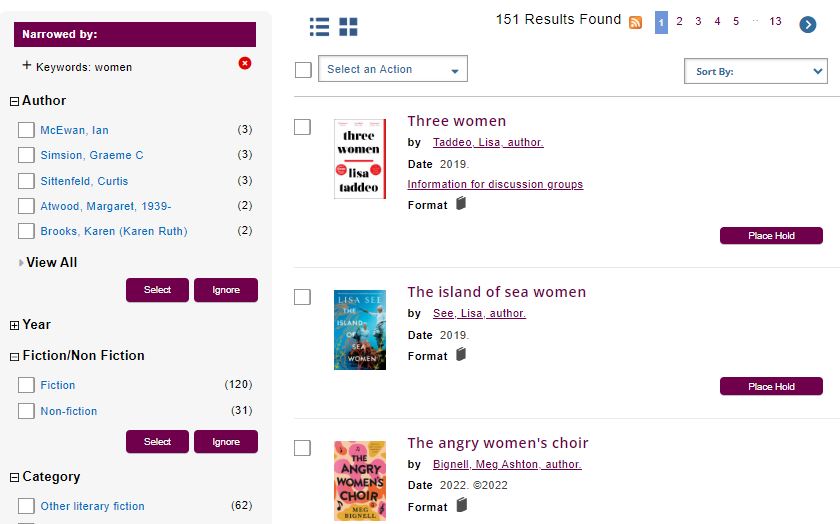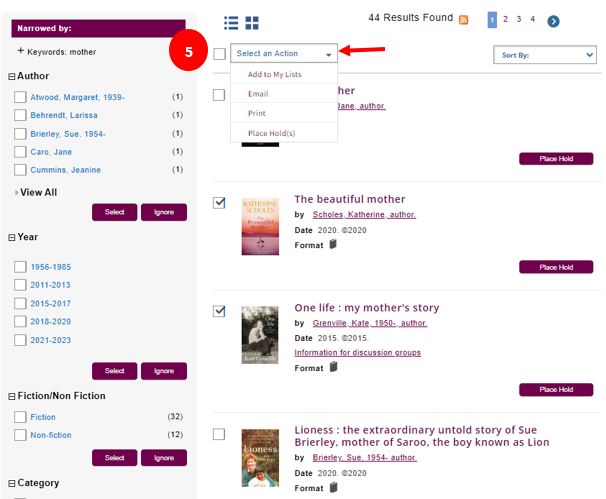 - Holds can be placed on multiple items by ticking the box beside the titles in the search results, then go to the Select an Action drop-down menu and select Place Hold(s).