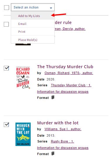 How do I add a title to My Lists? In the search results, tick the box next to the item(s), then go up to the Select an Action drop-down menu and click on Add to My Lists. If you are not logged in, this will add it to a temporary list, if you are logged in, you will be able to choose the list you want to add it to. It is recommended you login (see Log In) prior to adding titles to lists. If you have a default list set the selected titles will be added to the default list automatically.