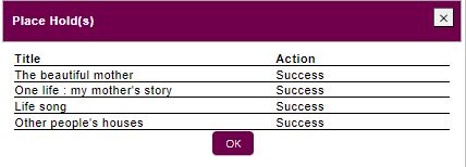 The system will display if the hold(s) were successfully placed. Click the OK button to return to your search.