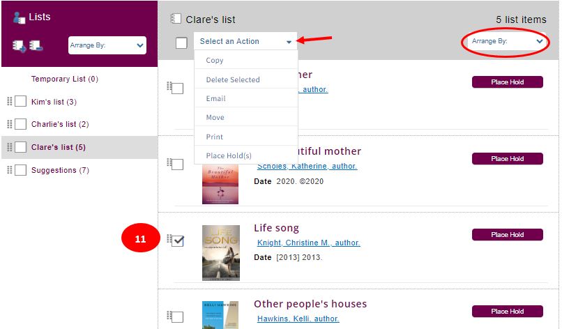 - Place Hold(s) adds the selected title/s to your holds list. Note: this does not remove the title from the list.