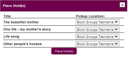 The title/s will display with Book Groups Tasmania as the Pickup Location. This pickup location can’t be changed and is not associated with the library you collect/return your sets from/to. Click the Place Hold(s) button.