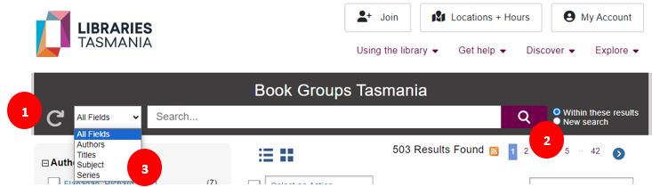 (3) You can search on all fields or narrow your search by author, title, series or subject using the All Fields drop-down menu. The All Fields drop-down menu is placed between the reset icon and the search box.