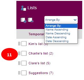 (11) The Arrange By: drop-down menu placed to the right of plus and minus icons can be used to sort lists alphabetically or by the date/time the list was created. The move icon can be used to re-arrange the order of your lists. The move icon is to the left of each list’s selection box. Click on the move icon and then drag and drop the lists into the order you want.