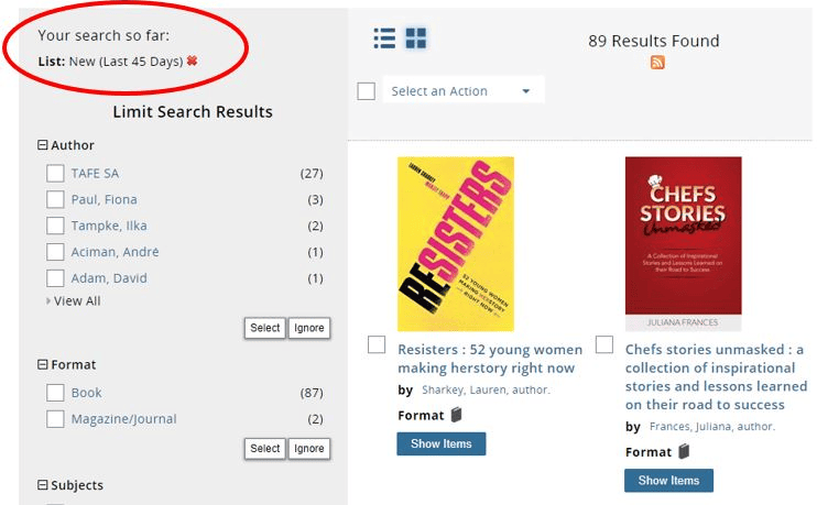 In many libraries new items that were recently added to the collection can be found via the NEW icon on the catalogue home page.