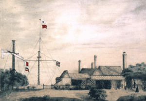 Our cottage at Port Arthur, [Capt?] and signal staff, and barracks
