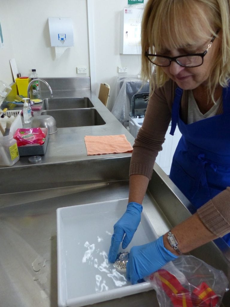 Dust was cleaned from the cup using a very soft brush, then it was washed in deionised water and pure soap and thoroughly rinsed.
