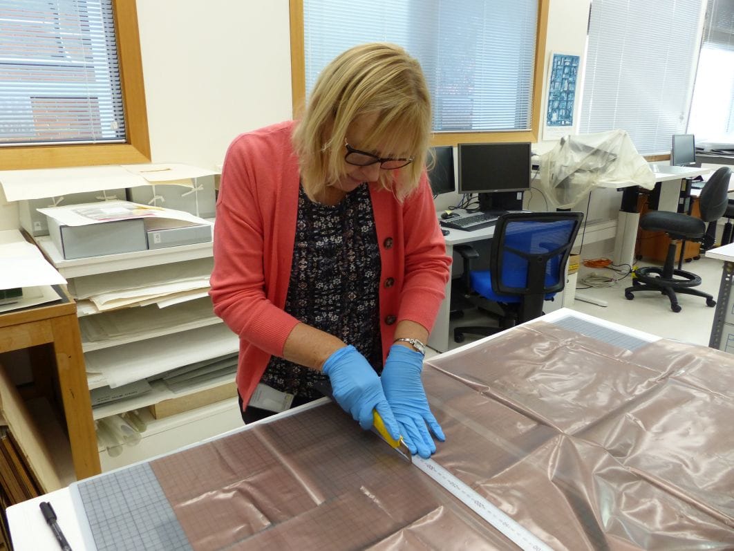 Custom storage was made by making a support cylinder for the ribbon from archival paper; a foam core and Etha foam base which fitted inside a custom-made archival corrugated board box with lid.