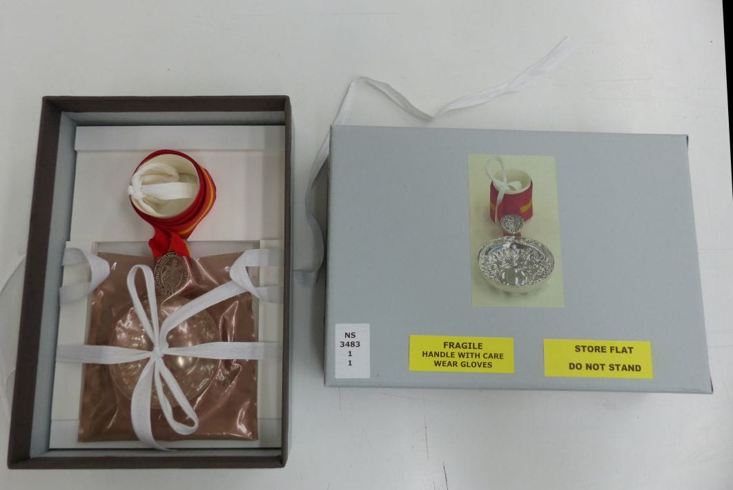 The tastevin or wine tasting cup came from Community Archives to Conservation for custom storage. The silver cup was beginning to tarnish and its red and yellow braided ribbon needed smoothing out. Gaynor Tollard (Conservation Technician) treated the cup before fabricating a special storage box.