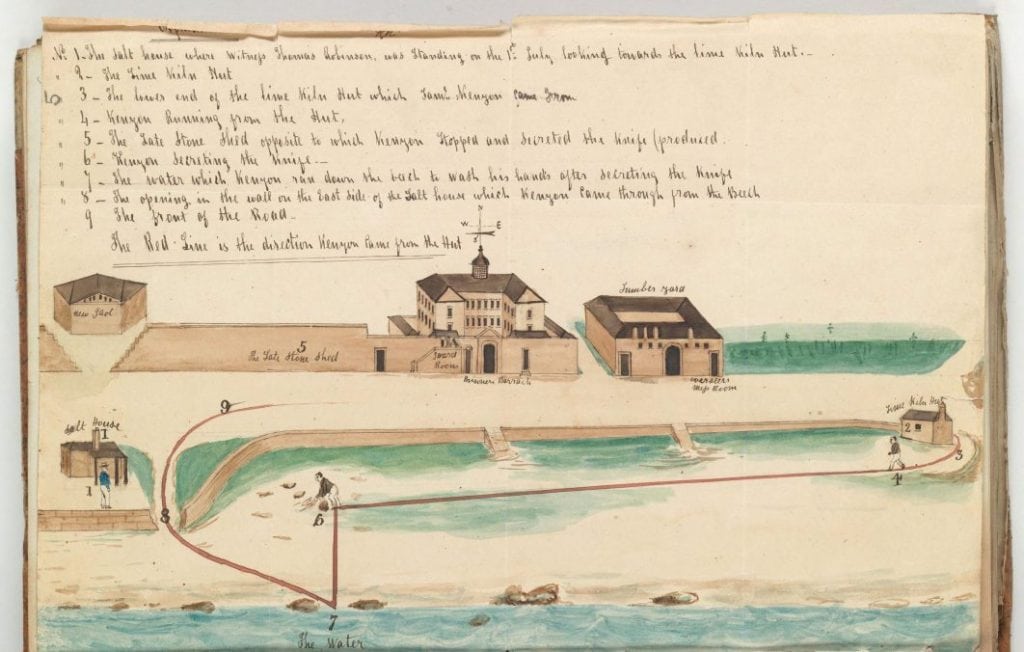Most of this volume comprises notes (e.g. witness statements, depositions, defence statements) relating to possibly the most violent uprising in Norfolk Island’s penal history, the Cooking Pot Riot of 1 July 1846 (14 convicts were charged with murder of four minor officials; 12 of them were convicted & executed). The rest of CSO20/1/449 covers a small number of unrelated capital offences of 1846. CSO20/1/449 also has some colourful and detailed plans at the beginning that appear to have been exhibited in court.