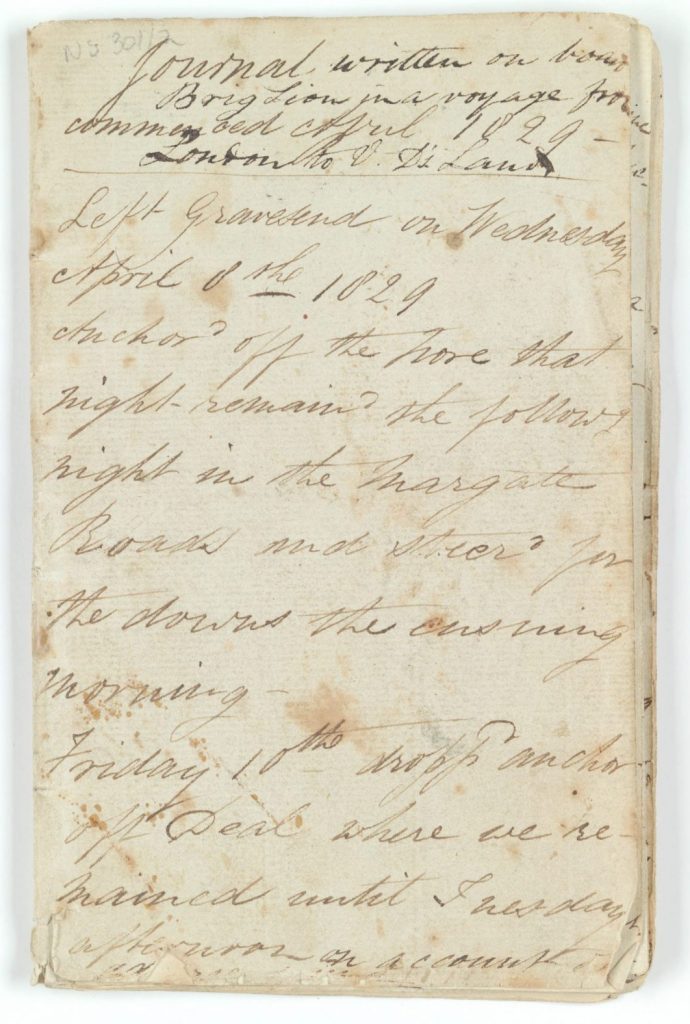 Journal written by John Owen Lord on board the Brig Lion during voyage, from London to Van Diemen’s Land (c1829) – Ref: NS301/1/2 (Tasmanian Archives)