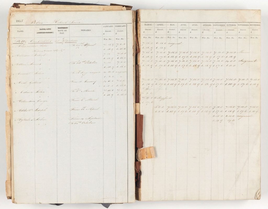 Register of the payment of salaries to officers of the police, 1855-57 – Ref: AUD45/1/1-3 (Tasmanian Archives)
