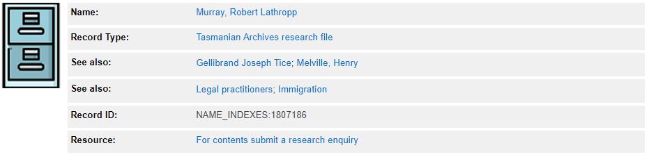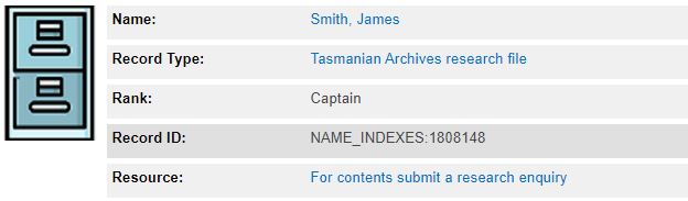A search for your person or subject in the Names Index will now include the Tasmanian Archives research file along with all other records on that person or subject. You will recognise the research file by its filing cabinet logo.