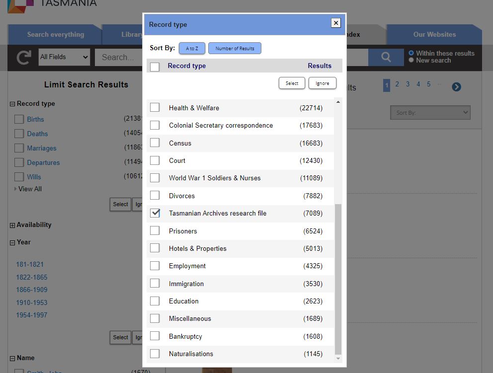 To limit your results to research files only select Record type: Tasmanian Archives research file (you’ll need to expand your record type with View All) in your Names Index search