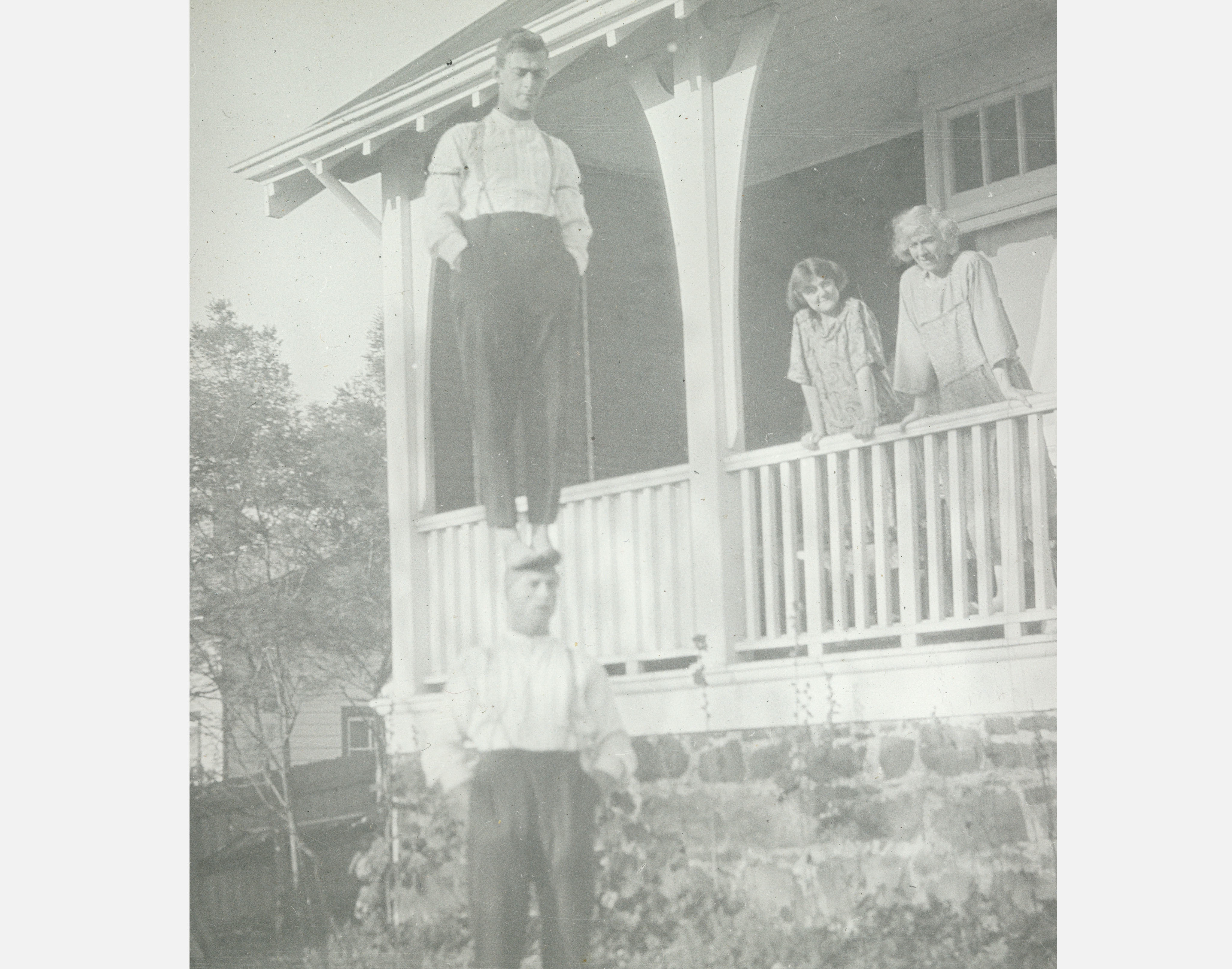 Many of the Libraries Tasmania lantern slides have been digitised, making them easier to view and helping to preserve the originals. This slide comes from the collection of Frederick Smithies—a Tasmanian conservationist, bushwalker, wilderness explorer, and photographer. The image, from the early 20th Century, is believed to show Smithies and a friend performing acrobatics in front of his home in Trevallyn, Launceston.