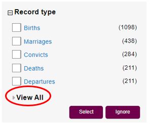 The Record type, Year and Name categories are expanded. The other categories can be expanded by clicking the + icon.