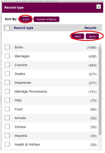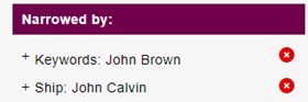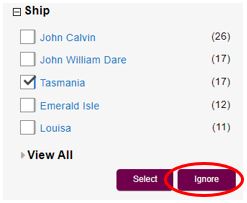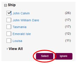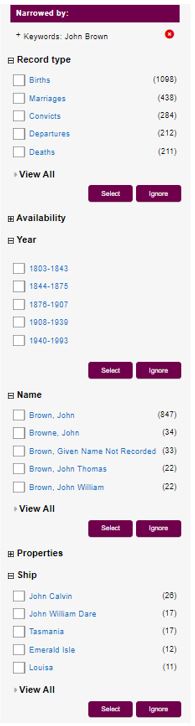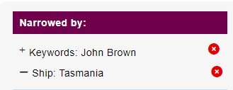 For example, you can expand the Ship category and click the Tasmania checkbox. Then select the Ignore button. The results now include those for the keywords John Brown but exclude any results for a John Brown who came on the ship Tasmania.