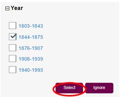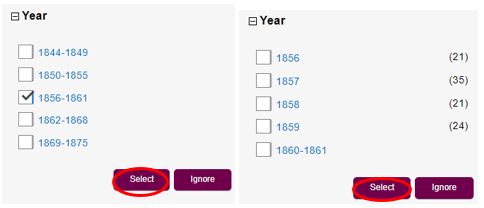 When you select a range, the years are split into 5 more limit ranges allowing you to continue to drill down until single years display.
