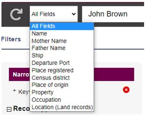 The default selection is All Fields or use the drop-down to select various fields including Name, Ship, Place registered, Census district and more.
